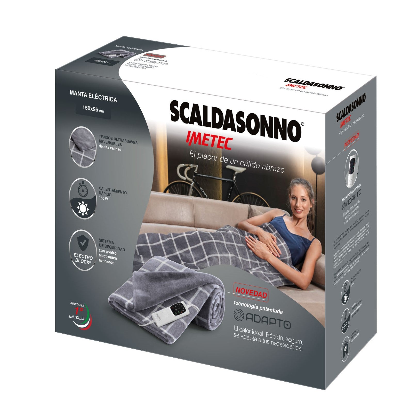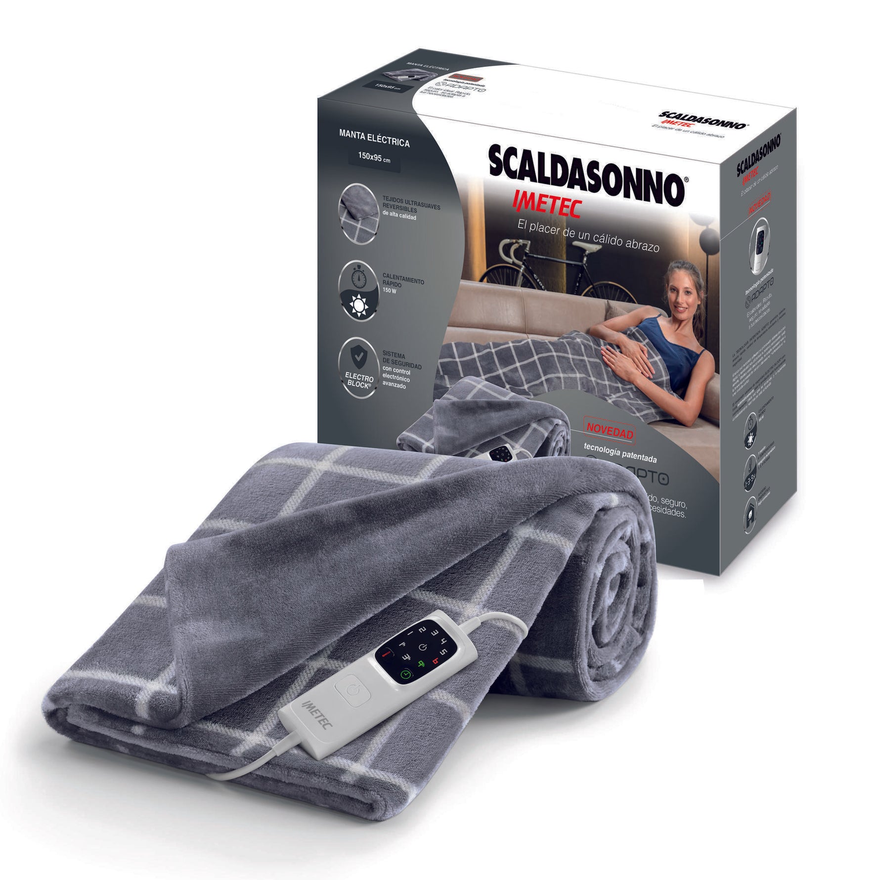 La nueva Manta Eléctrica Gris Scaldasonno 150x95 cm con tecnología patentada Adapto de Imetec, permite que tus momentos de relajación sean únicos y te brinda el placer de disfrutar de una calidez personalizada, donde y cuando quieras: en el sofá, en la cama, en la terraza. Lo enciendes, seleccionas la temperatura y está inmediatamente funcionando.